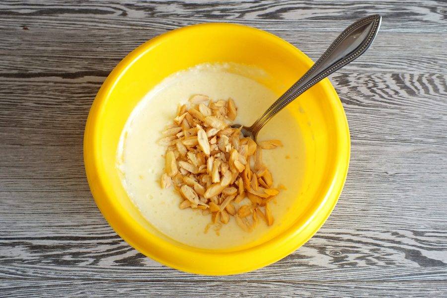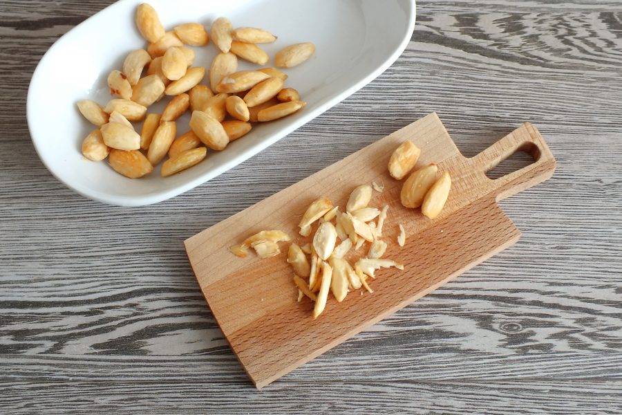Миндаль очистите от кожицы. Нарежьте крупными кусочками.