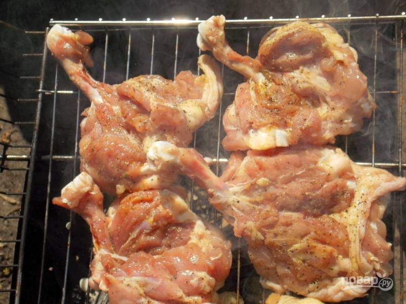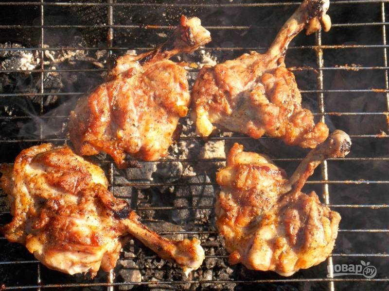 Подготовьте мангал и угли. Обжарьте мясо до готовности с двух сторон.