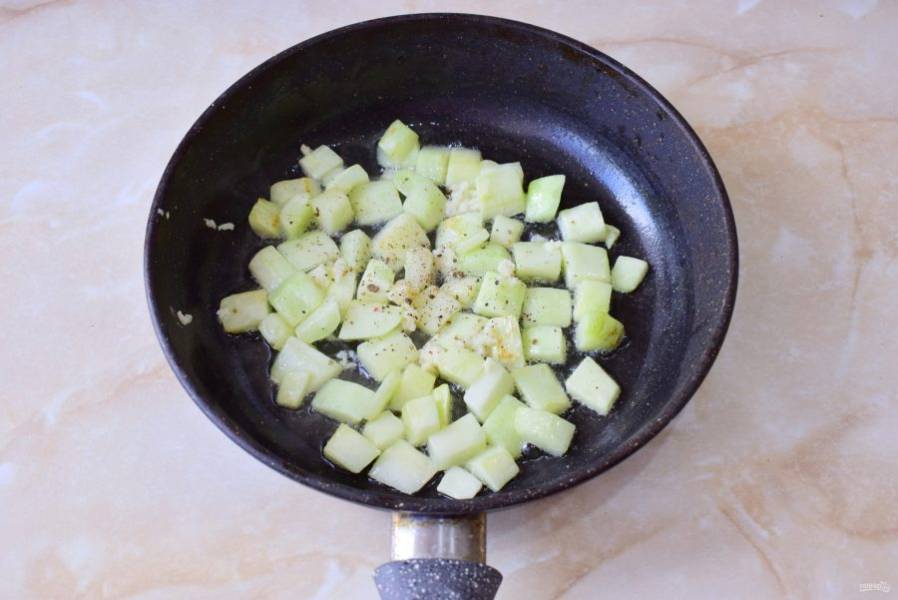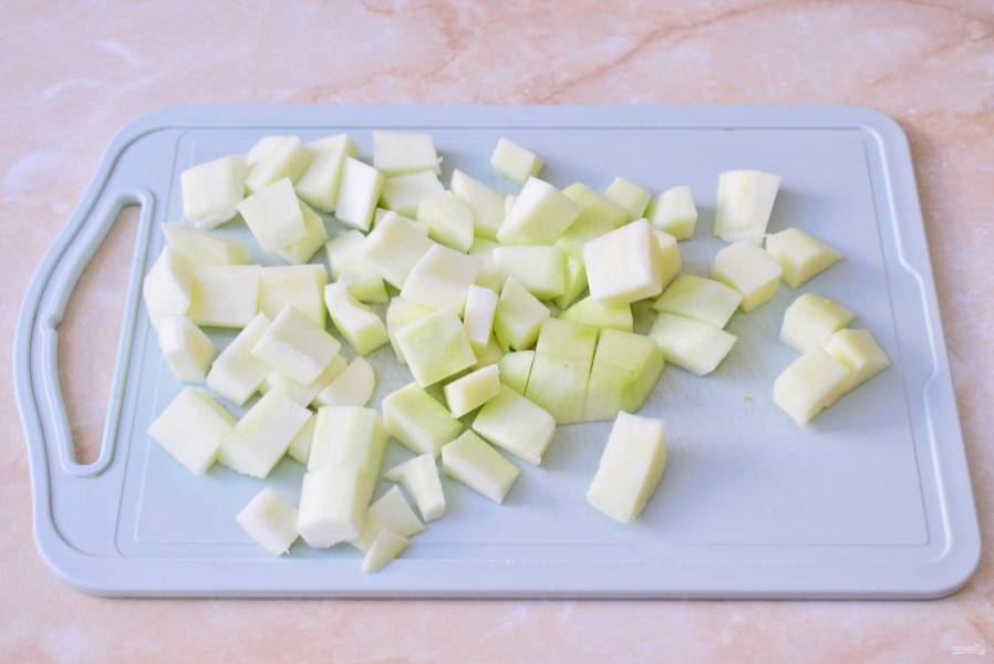 Кабачок помойте и очистите от кожуры. Если шкурка светлая, то можно не очищать. Нарежьте кабачок кубиками.