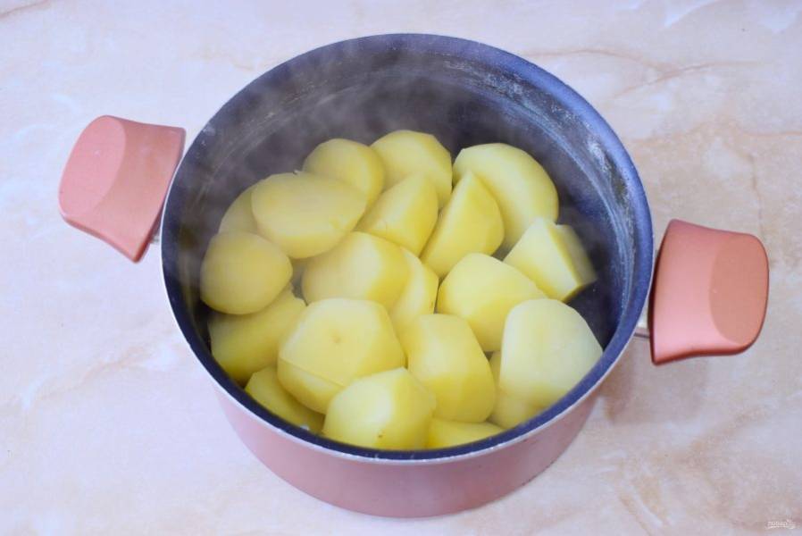 Картофель очистите от кожуры, ополосните от загрязнений и выложите в кастрюлю. Крупные клубни разрежьте на 2-4 части. Залейте картофель водой, поставьте на огонь и доведите до кипения. Подсолите. Варите минут 15 до мягкости картофеля.