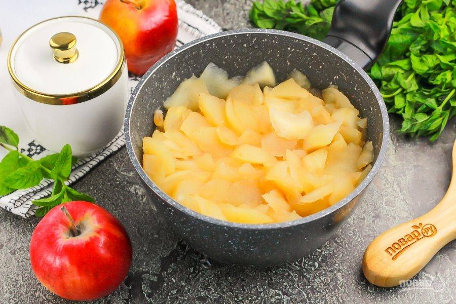 Поместите емкость на плиту и доведите все до кипения. Затем убавьте нагрев и томите под крышкой яблочную нарезку примерно 15-20 минут.