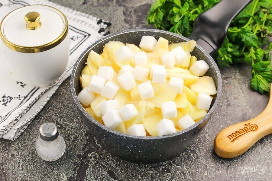 Затем срежьте мякоть небольшими ломтиками в казан, ковш или кастрюлю с антипригарным дном. Влейте в нее немного теплой воды. Много жидкости добавлять не стоит, так как яблочная нарезка еще выпустит сок.