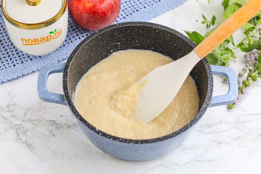 Отпюрируйте ее погружным блендером в однородную массу в течение 3-4 минут. Важно, чтобы в пюре не попадались кусочки яблок.