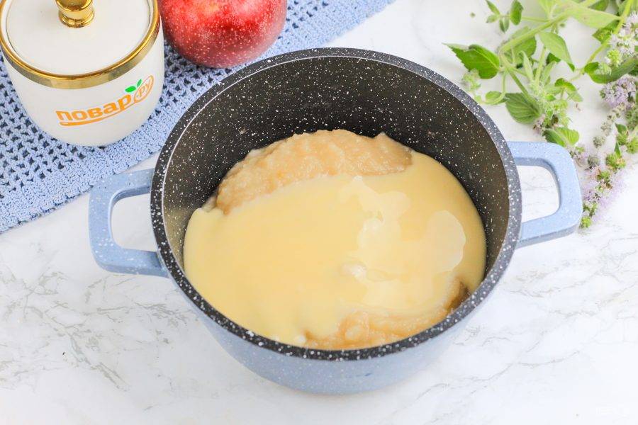 Выложите яблочное пюре в казан или ковш с антипригарным дном, долейте сгущенное молоко. По желанию можно добавить ванильный сахар или молотую корицу. Перемешайте и поместите емкость на плиту, включая умеренный нагрев.