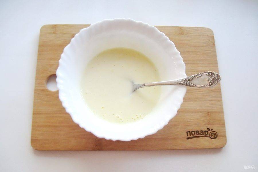 Приготовьте тесто. В миску налейте кефир и добавьте желток.