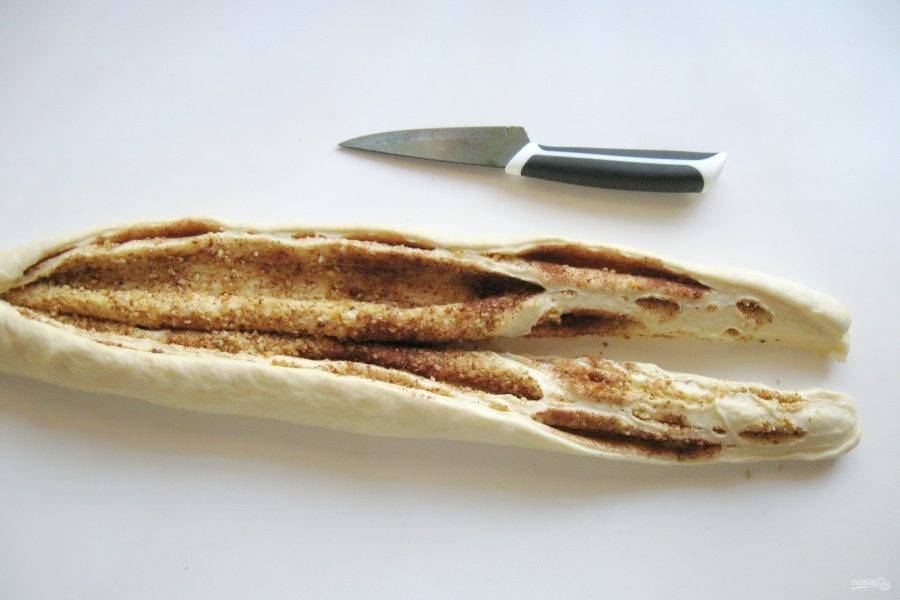 Корицу смешайте с одной столовой ложкой сахара и посыпьте тесто.