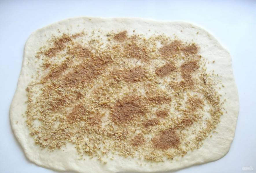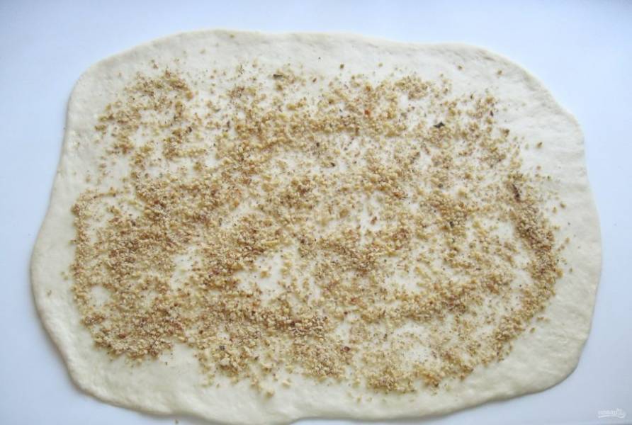 Тесто обомните и раскатайте в пласт. Посыпьте молотыми орехами. Орехи берите любые по наличию и вашему вкусу.