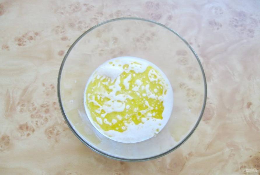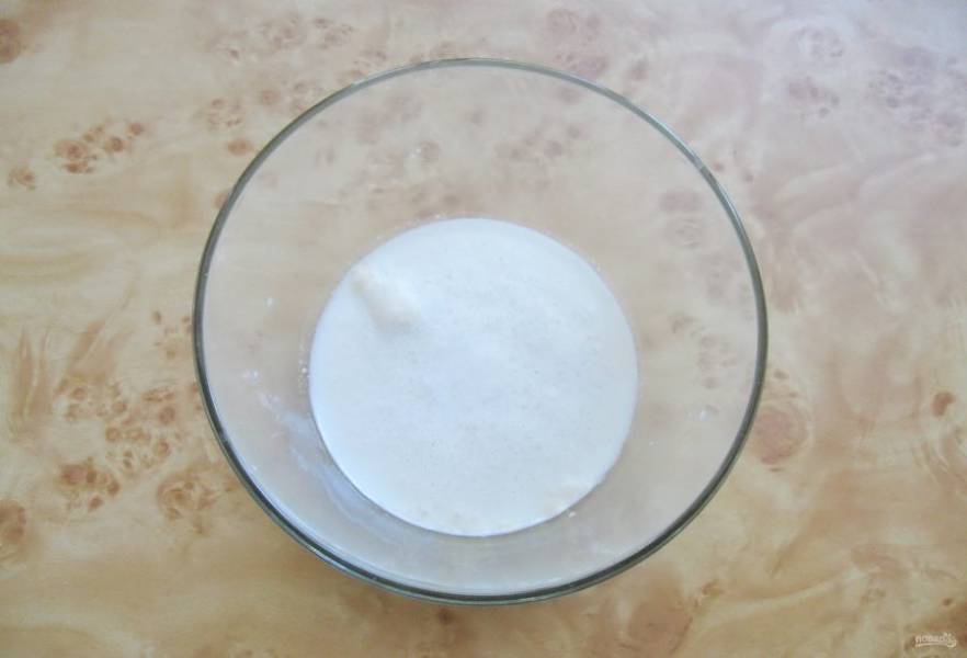В теплое молоко выложите дрожжи. У меня свежие, сухих потребуется 7-8 грамм. Добавьте одну столовую ложку сахара и перемешайте. Через 10-15 минут дрожжи вспенятся.