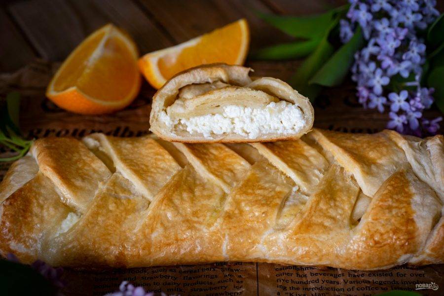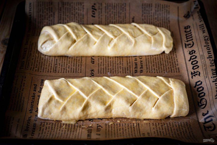 Точно также поступите со второй частью теста и оставшейся творожной начинкой и в итоге у вас должно получиться две плетенки. Выложите их на противень, застеленный пергаментом для выпекания и смажьте каждую оставшейся частью взболтанного яйца с помощью силиконовой кисти. Заранее разогрейте духовку до 180 градусов и отправьте плетенки выпекаться на 30-40 минут.