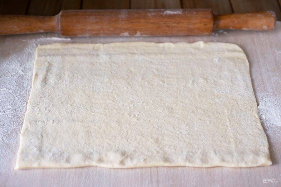 Рабочую поверхность припылите немного мукой. Слоеное тесто разделите на две равные части. Одну часть раскатайте скалкой в пласт (толщина примерно 5-6 мм.) прямоугольной формы.