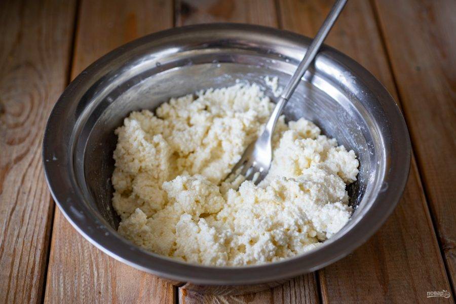 Вилкой активно перемешайте эти ингредиенты до получения однородной творожной массы.