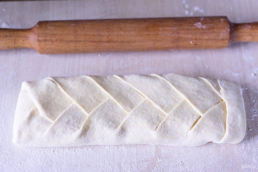 На центр прямоугольника из теста выложите половину творожной массы, как на фото, края теста нарежьте широкими лентами.