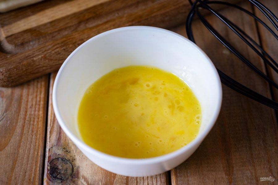 В отдельную мисочку вбейте яйцо и активно перемешайте его венчиком до получения однородной смеси.