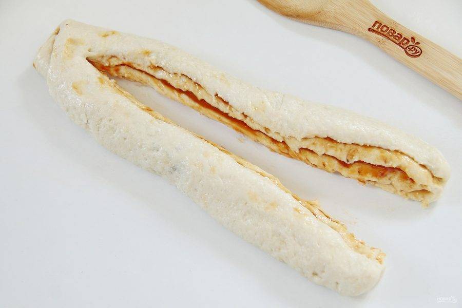 Подошедшее тесто выложите на смазанную маслом поверхность и разделите на две части. Каждую раскатайте в форме прямоугольника, толщиной около 5 мм и смажьте тонким слоем сгущенного молока.