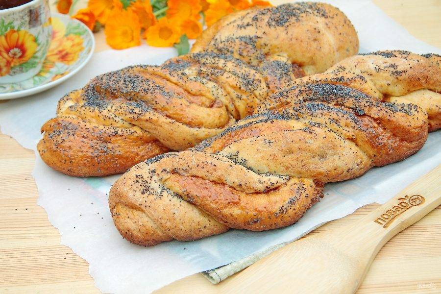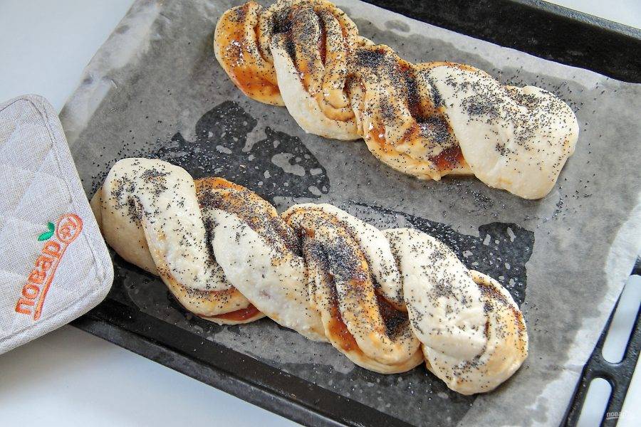 Перенесите заготовки на противень, щедро смазанный маслом, даже если будете использовать пергамент. Посыпьте плетенки маком и оставьте на 15 минут.