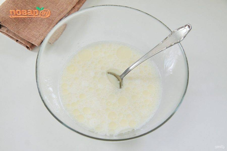 Соедините теплую воду, молоко, сахар, соль, ванилин, творог и растительное масло.