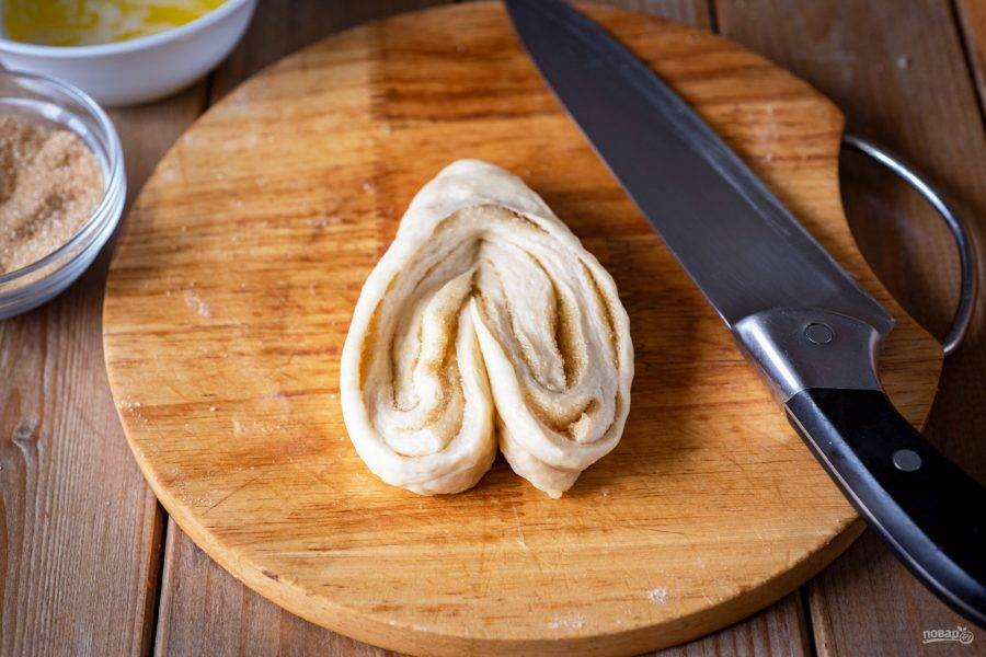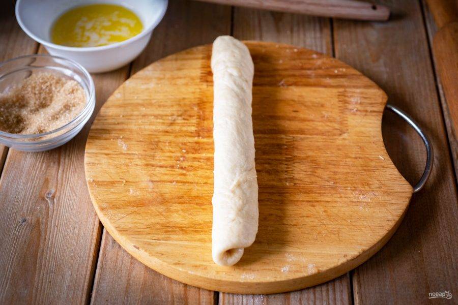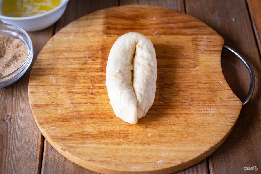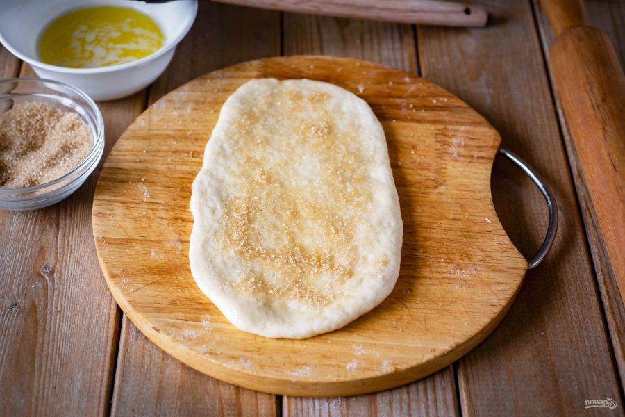 Рабочую поверхность смажьте тонким слоем растительного масла и один шарик раскатайте в удлиненный овал с помощью скалки. Растопите 20 грамм сливочного масла в маленькой кастрюльке. С помощью силиконовой кисти смажьте поверхность раскатанного теста слоем растопленного масла. Поверх обильно присыпьте слоем сахара. Я использовала в этом рецепте коричневый сахар, но это не важный момент — можно использовать и обычный белый сахар.