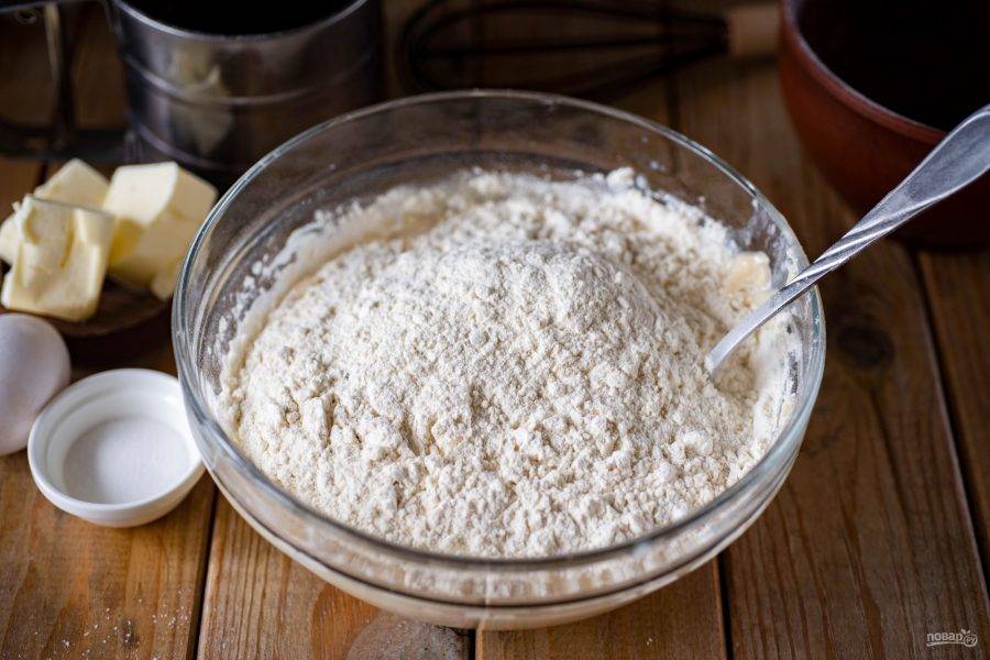 Все необходимые ингредиенты сразу же выложите на стол. Муку заранее просейте. Масло сливочное для теста (80 грамм) должно быть мягким, поэтому выложите его из холодильника заранее.