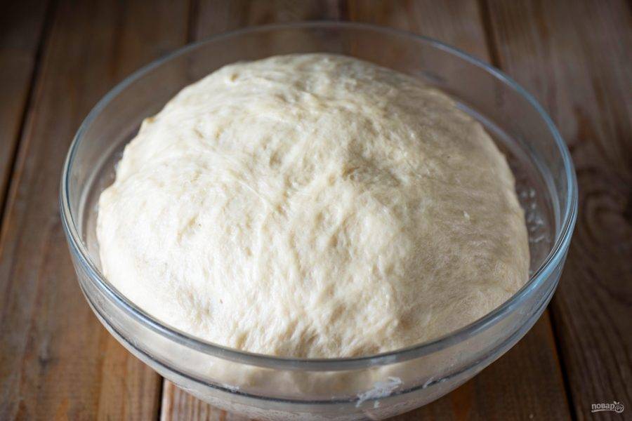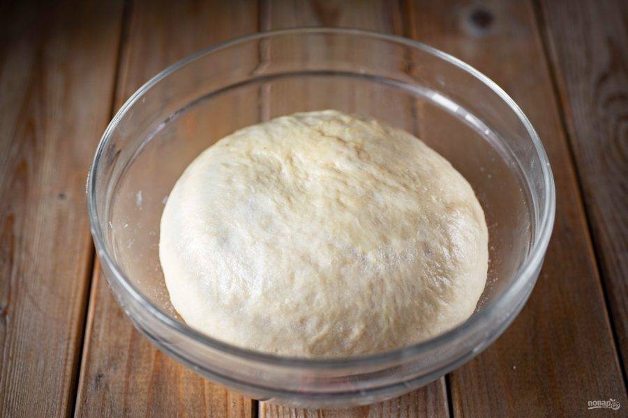 Готовое тесто получается мягкое, эластичное, не прилипающее к рукам. Округлите его в миске, миску накройте полотенцем и оставьте подходить на 2 часа. За это время сделайте одну обминку.