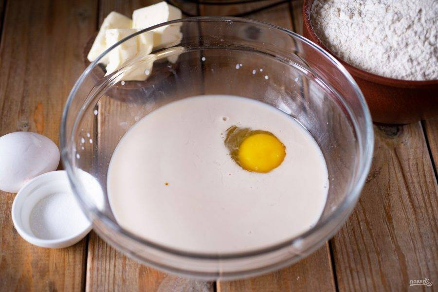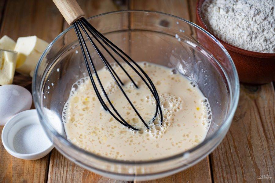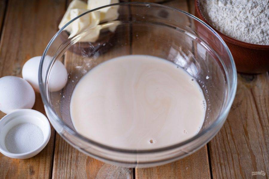 В просторную миску залейте теплую воду и разведите в ней прессованные дрожжи до полного растворения.