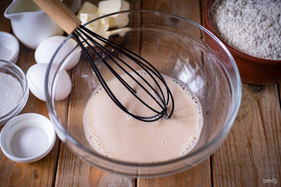 Залейте теплое молоко и добавьте 100 грамм сахара, размешайте.