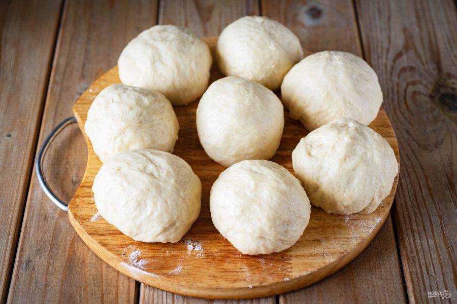 Все тесто поделите на части по 100 грамм каждая. Каждую часть подкатайте в шарик.