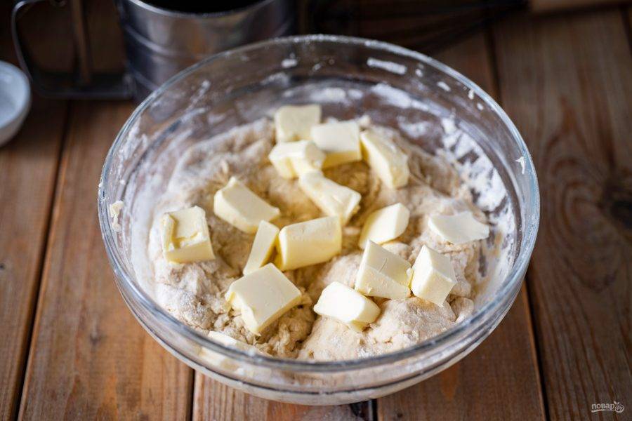 В это тесто вмешайте 80 грамм мягкого сливочного масла, нарезанного для удобства кусочками.