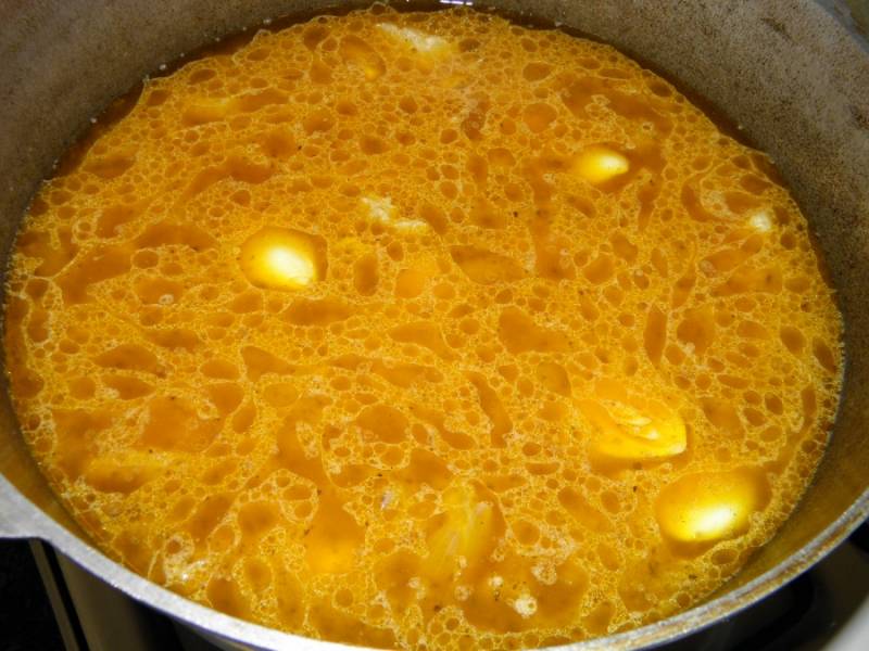 10. Залейте плов водой с солью так, чтобы вода чуть покрыла рис, была выше уровня на 1-1,5 сантиметра. Закройте крышкой и варите при слабом кипении 40 минут.