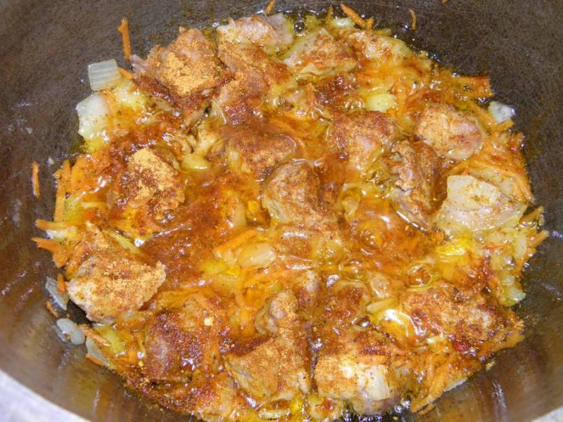 7. К обжаренному мясу добавьте лук и морковь, обжарьте все вместе до золотистого цвета моркови.