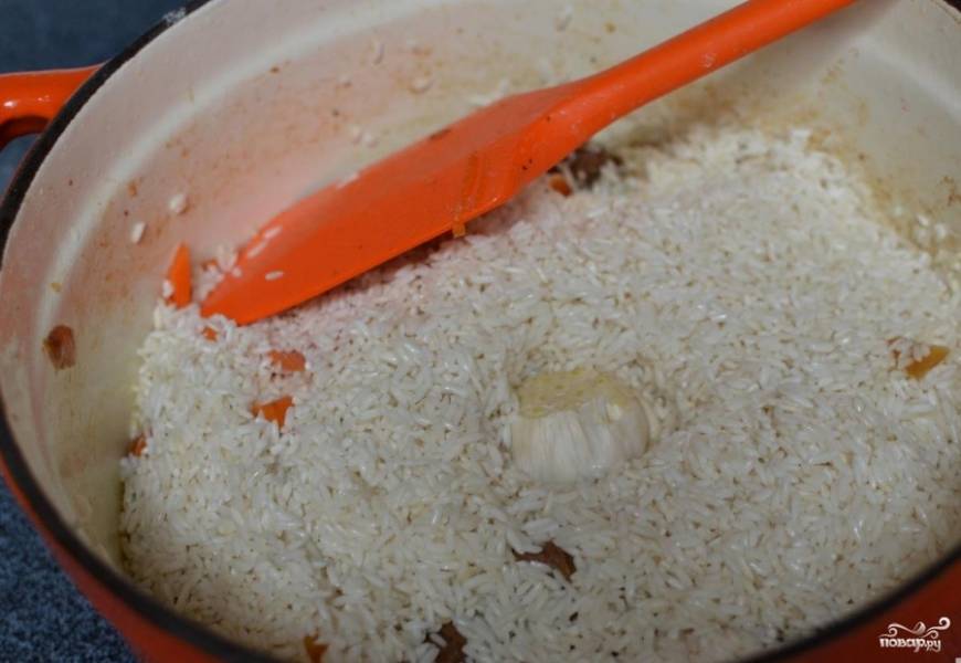 Заливаем все водой. Вода должна покрывать рис на 2,5 см. Доводим до кипения, а затем убавляем огонь до самой маленькой, накрываем кастрюлю крышкой и тушим все в течение 40-50 минут. На 20-ой минуте приготовления содержимое кастрюли следует перемешать.