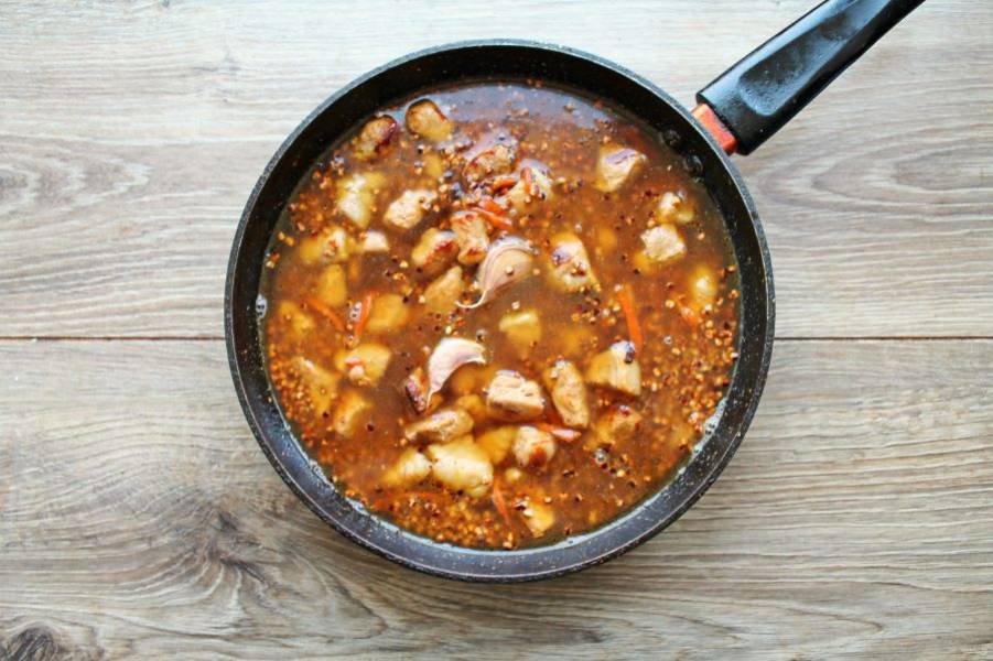 Всыпьте к мясу обжаренную гречку, разровняйте и выложите дольки чеснока в кожуре.