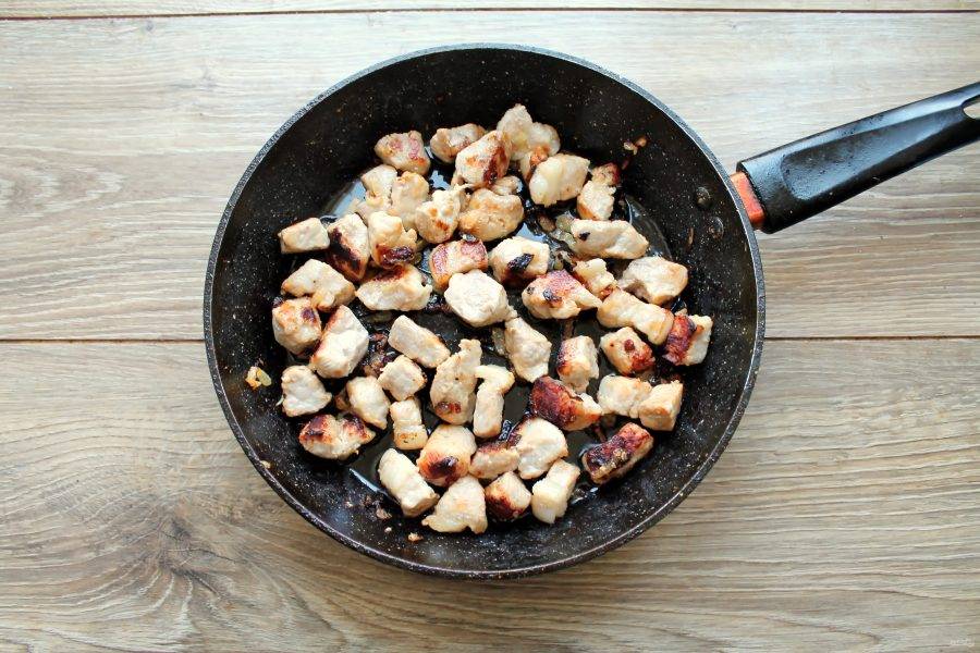 Обжарьте мясо с луком на сильном огне в течение 5 минут, перемешивая.