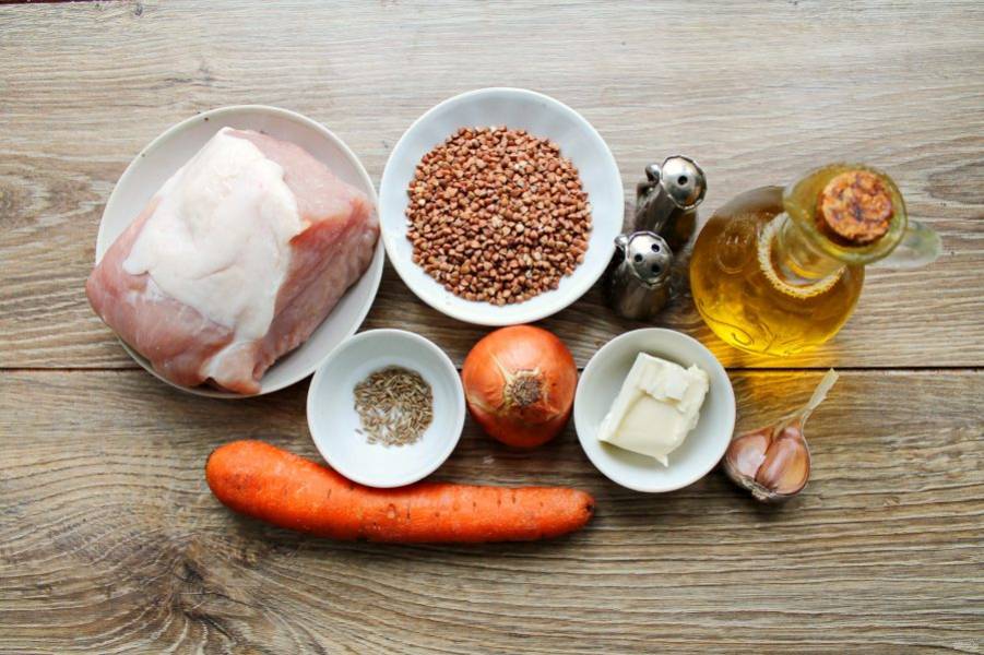 Подготовьте все необходимые ингредиенты для приготовления плова из гречки со свининой.