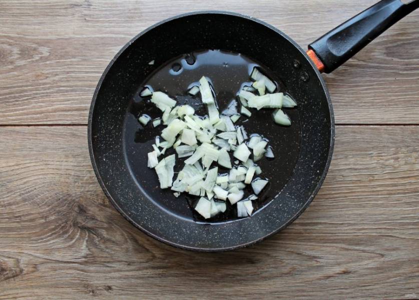 В сковороду налейте растительное масло и выложите порезанный лук.