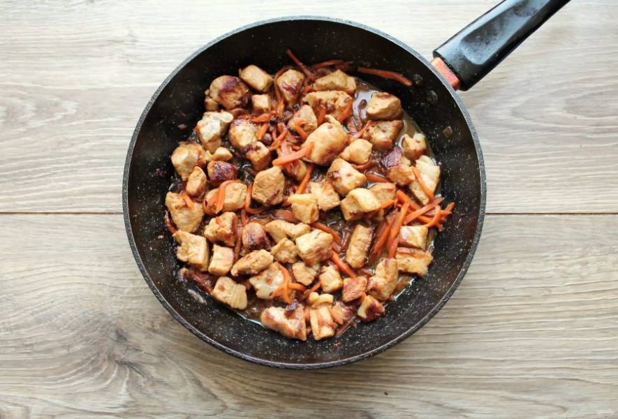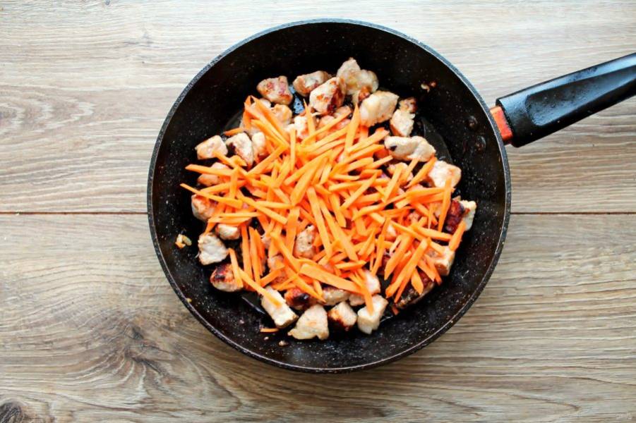 Морковь почистите и порежьте соломкой, добавьте к мясу с луком. Обжаривайте все на медленном огне в течение 5-7 минут.