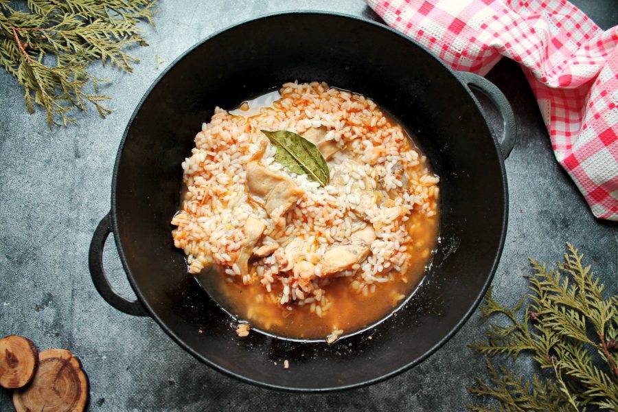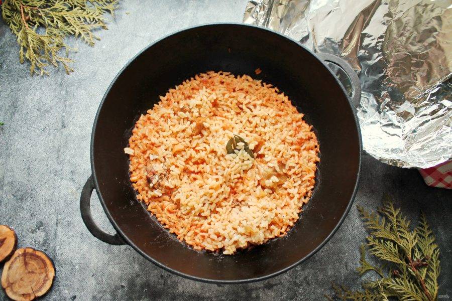 Казан закройте крышкой или фольгой для запекания и поставьте в горячую духовку. Запекайте в течение 30 минут при температуре 180 градусов. Готовый плов с нутрией достаньте и сразу подавайте к столу.