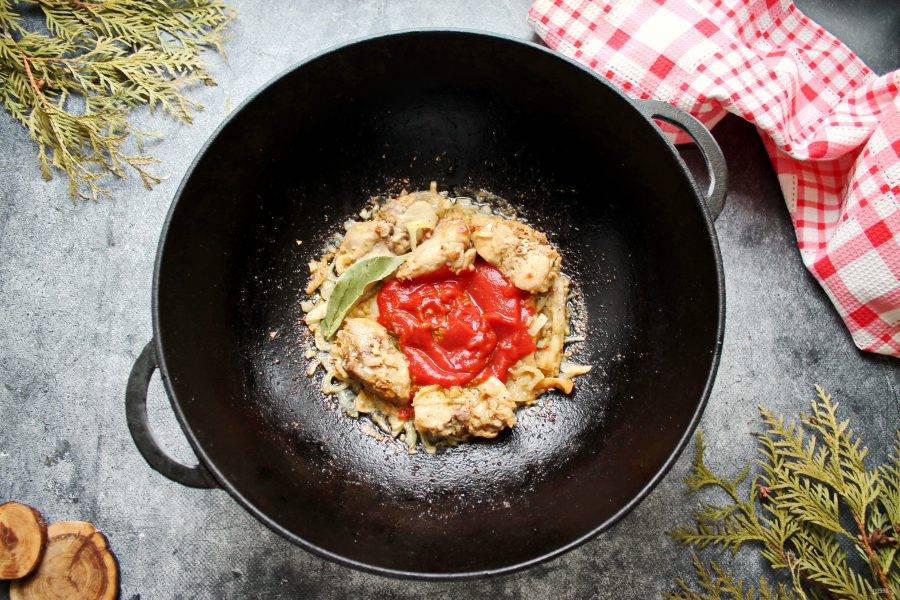 Выложите томатную пасту, лавровый лист и перемешайте.