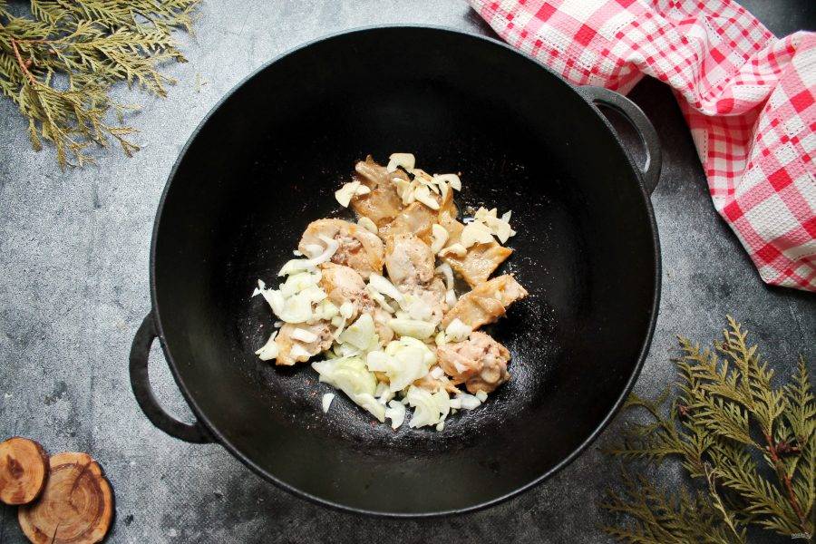 Репчатый лук почистите и порежьте, добавьте к нутрии и перемешайте.