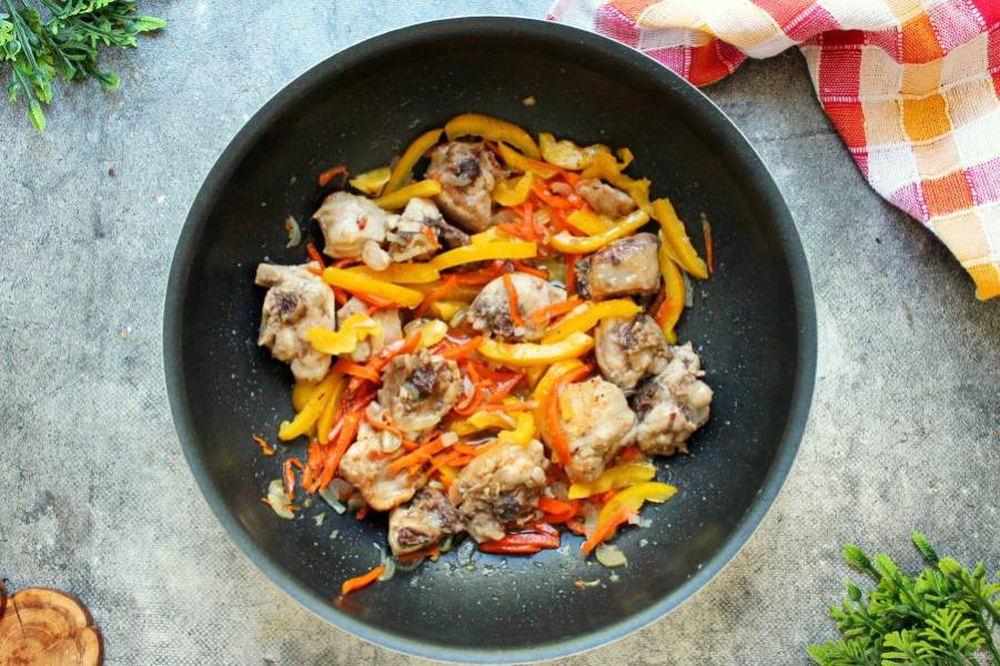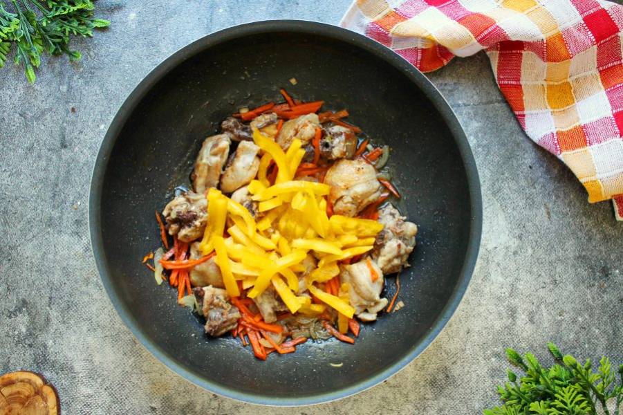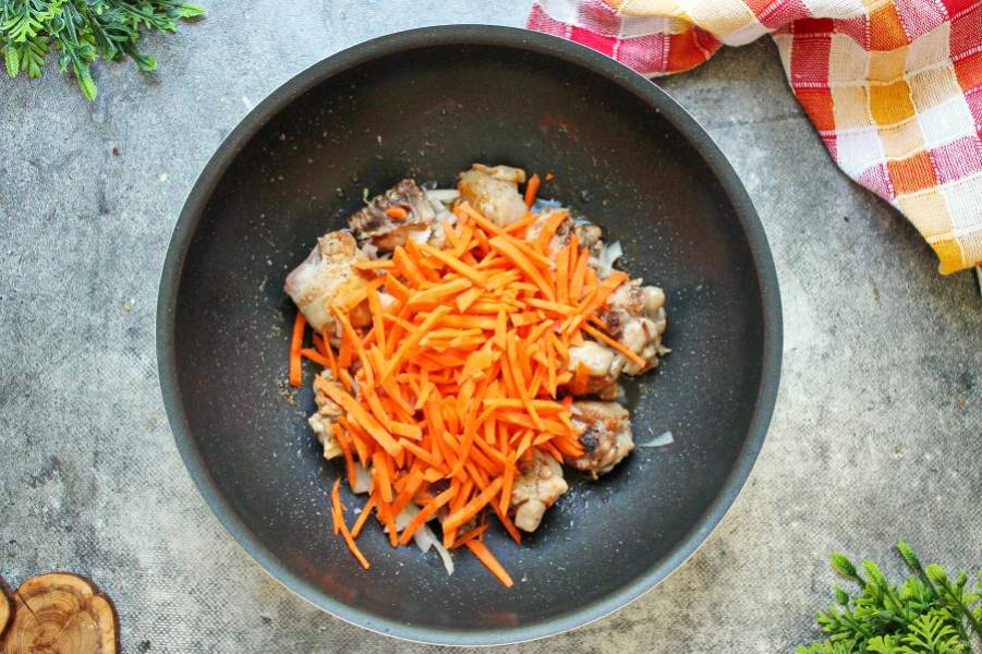 Морковь порежьте тонкой соломкой и добавьте к курице и луку. Обжаривайте все на среднем огне в течение 4-5 минут, перемешивая.