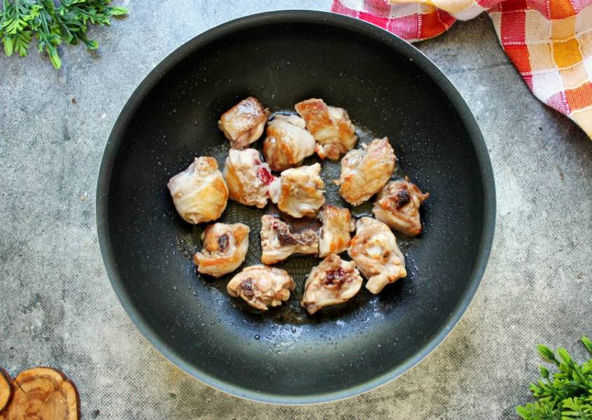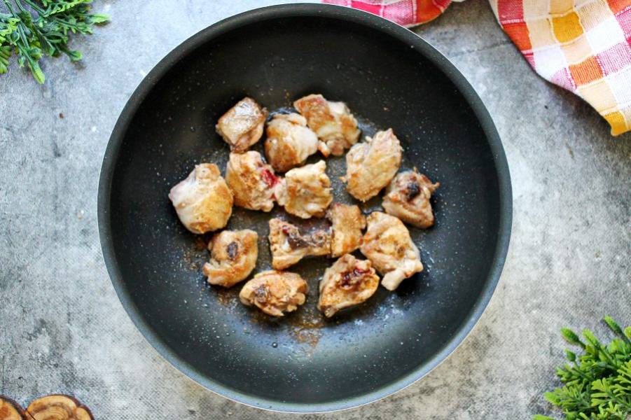 Куриные окорочка сполосните, обсушите и порежьте на кусочки. В казан или сковороду с толстым дном налейте растительное масло и разогрейте на среднем огне. Положите кусочки курицы и обжаривайте со всех сторон до золотистой корочки. Примерно около 4-6 минут.
