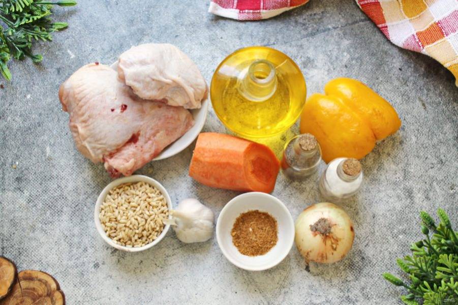 Подготовьте все необходимые ингредиенты для приготовления плова из куриных окорочков. Морковь, репчатый лук почистите и сполосните, перец болгарский очистите от семян и плодоножки.