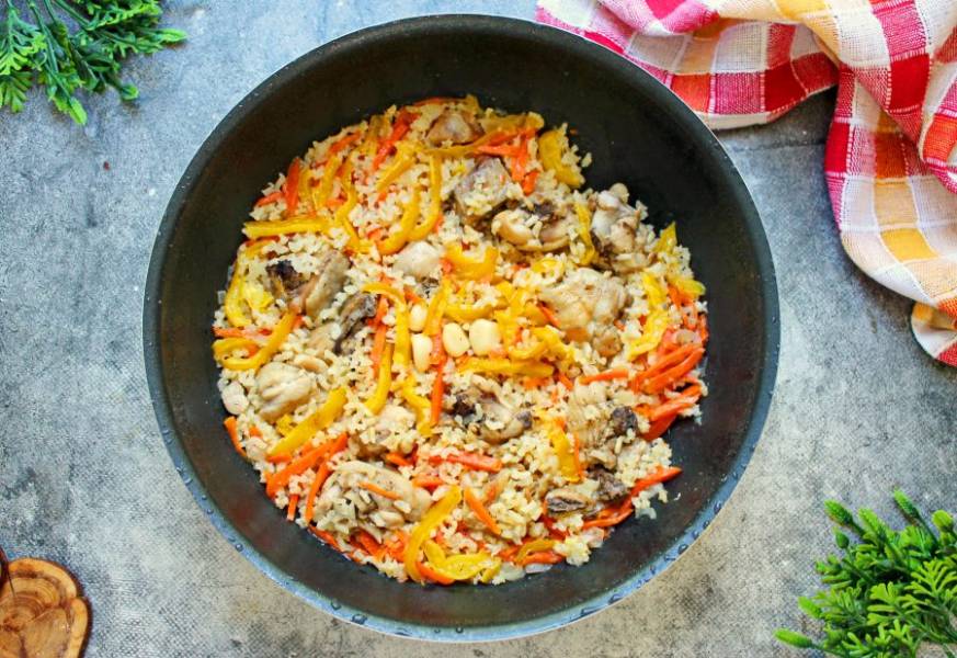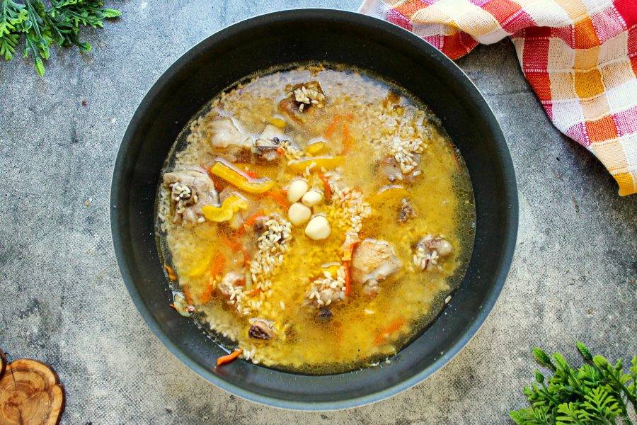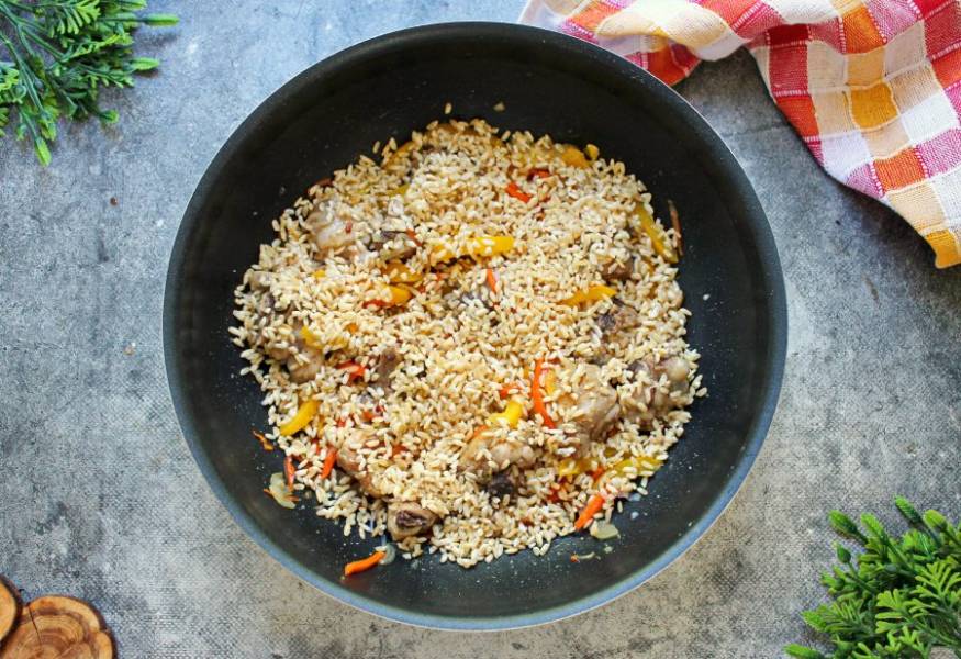 Доведите все до кипения и закройте крышкой. Убавьте огонь до минимального и готовьте плов в течение 35-45 минут, до готовности. Время будет зависеть от объема казана и интенсивности огня. Вода должна полностью впитаться в рис, но он остается рассыпчатым. Снимите плов с огня, дайте постоять 5-10 минут и подавайте.