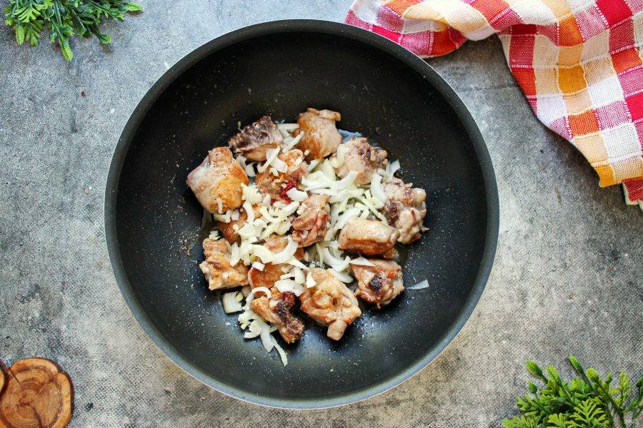 Репчатый лук порежьте тонкими полукольцами и выложите в казан с окорочками.