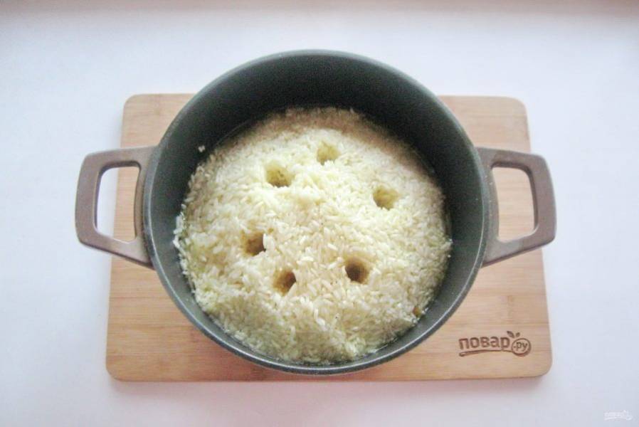 После соберите рис горкой к середине от краев казана. Деревянной палочкой сделайте углубления в рисе до самого дна казана.