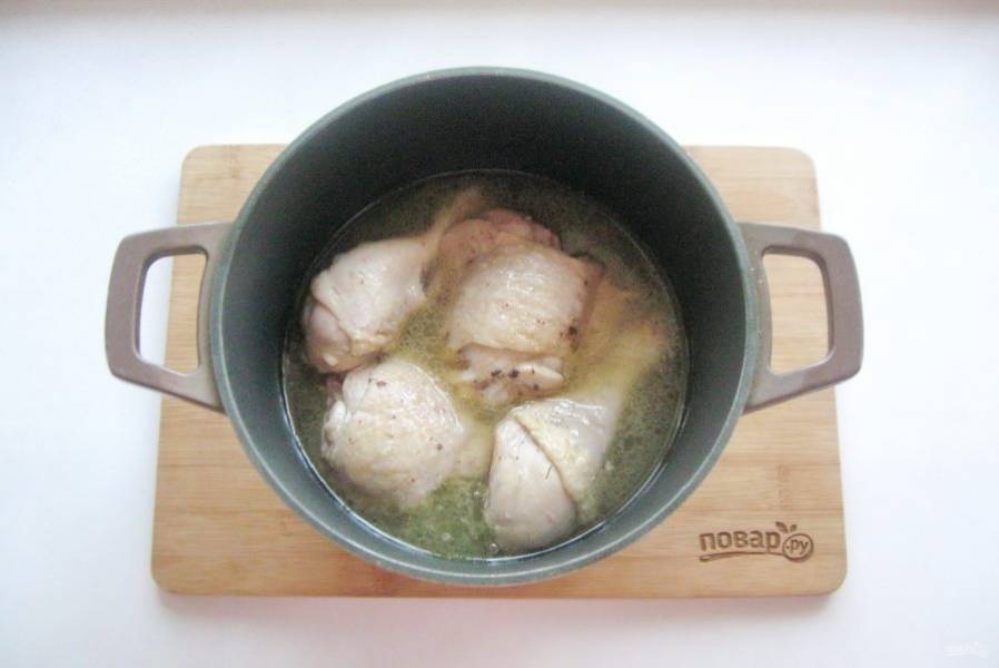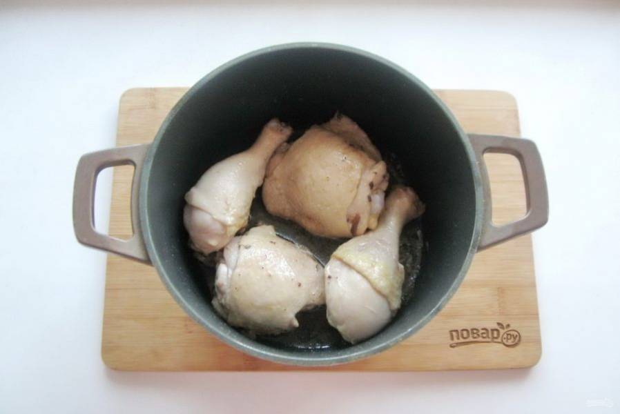 Налейте 20 мл. рафинированного подсолнечного масла и жарьте курицу в казане 10-12 минут.