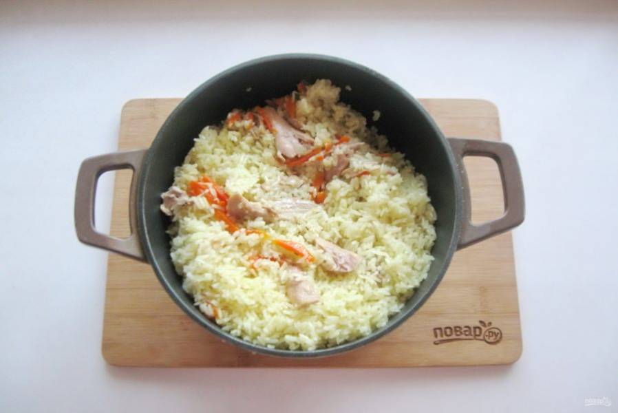 Накройте казан крышкой, огонь убавьте до самого минимального. Я еще ставлю рассекатель пламени на конфорку. Готовьте плов еще 20 минут до полного испарения жидкости. После огонь выключайте, дайте плову настояться 20 минут и перемешайте рис с курицей и овощами.