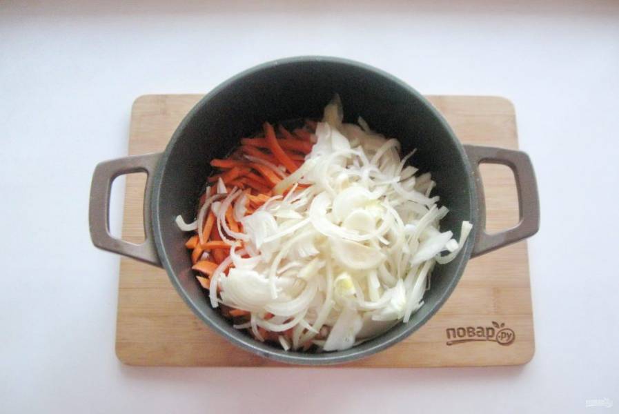 Лук и морковь очистите, помойте. Морковь нарежьте соломкой, а лук полукольцами. Добавьте в казан с курицей. Налейте еще 30 мл. подсолнечного масла.