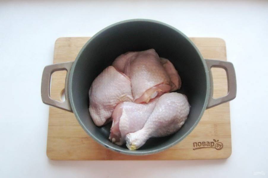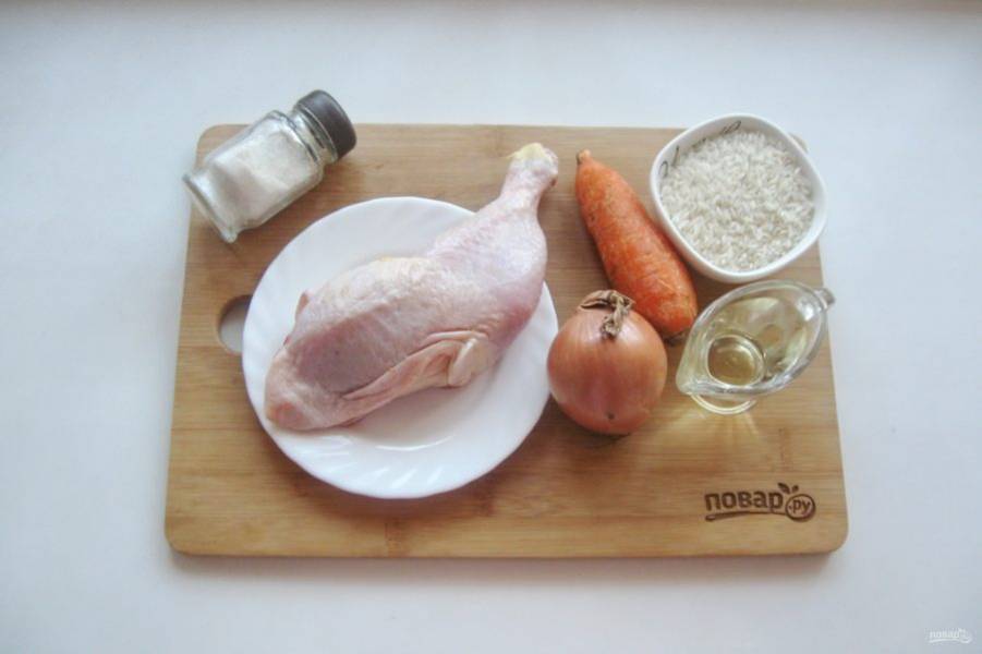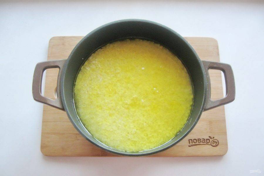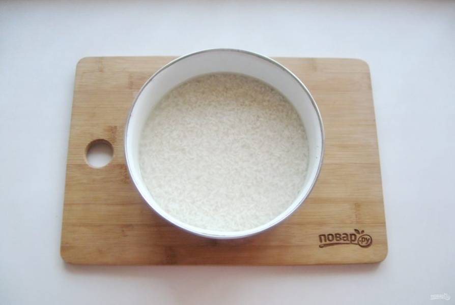 Пока курица готовится, займитесь рисом. Тщательно его промойте от крахмала в 8-10 водах. Залейте горячей водой на 20-25 минут.