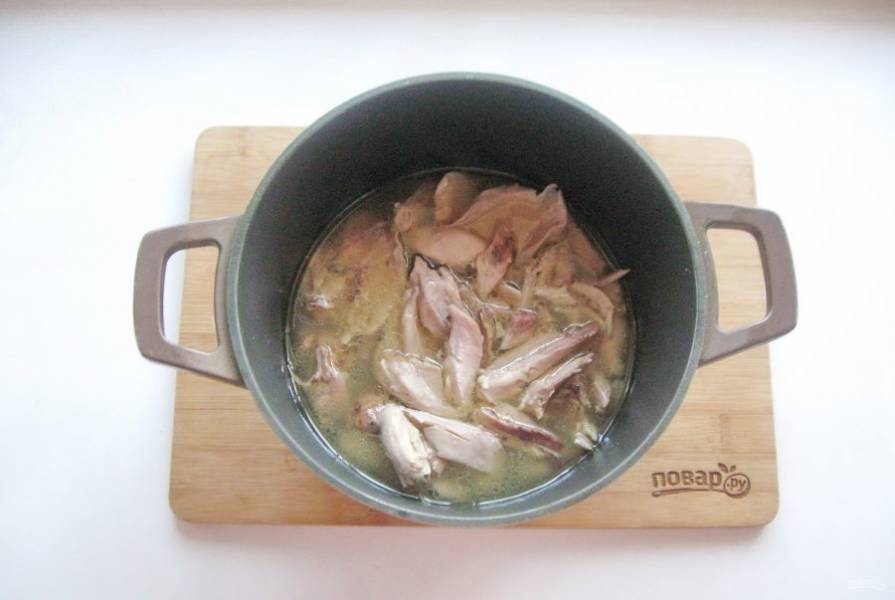 Готовую курицу разберите, удаляя шкурку и кости. Выложите назад в казан.