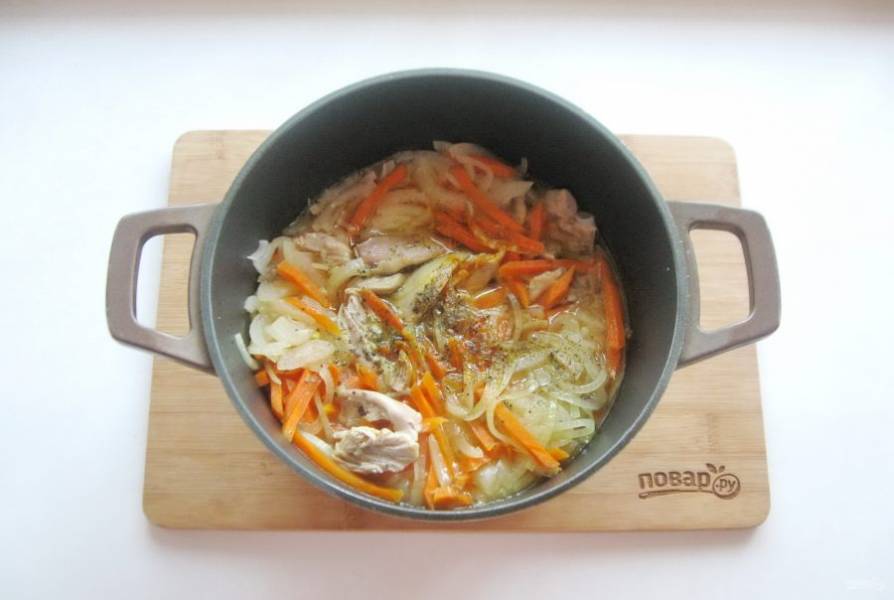 Тушите овощи с курицей 10-15 минут перемешивая. Добавьте соль и специи, перемешайте.